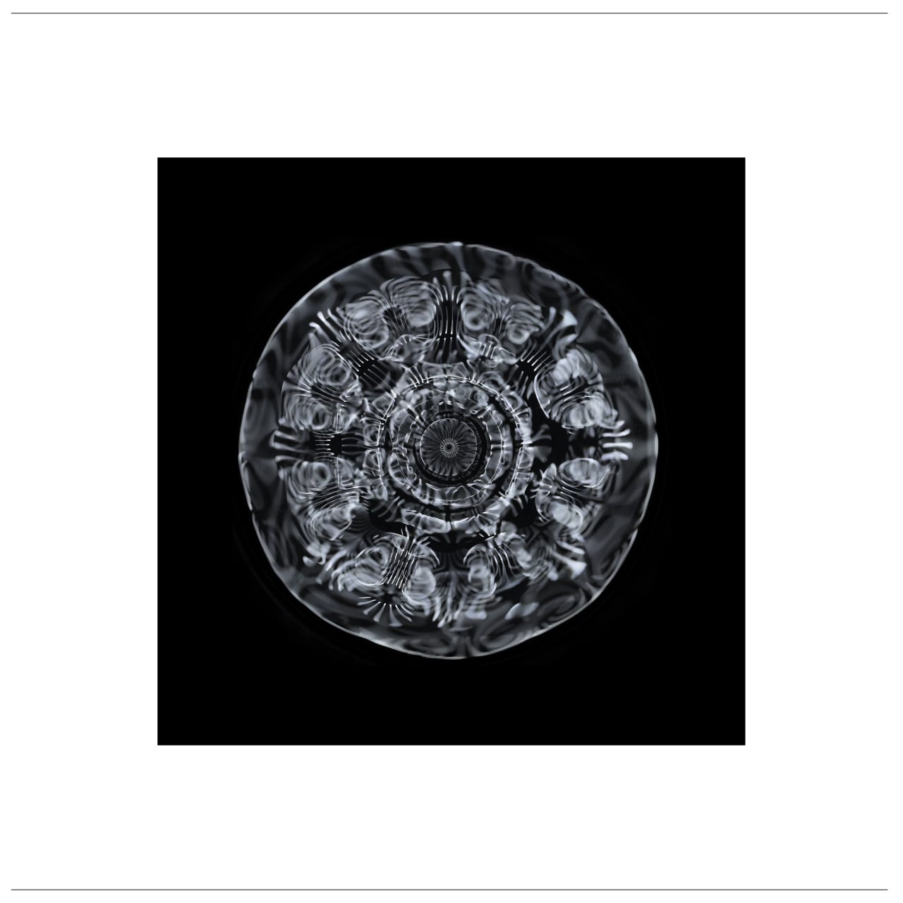 沼島の「石英の奏でる音」を琵琶湖に浮かぶ竹生島の「弁財天の霊水」にサイマティクスという器械を通して転写し映し出された紋様。何もない水面に紋様が浮かび上がってくる様は、まるで「無」から「有」が生まれ出ずる神秘に立ち会っているかのよう。