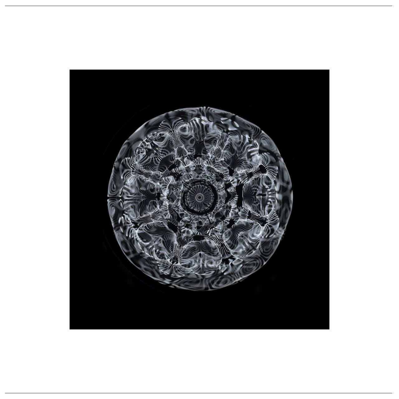 沼島の「石英の奏でる音」を琵琶湖に浮かぶ竹生島の「弁財天の霊水」にサイマティクスという器械を通して転写し映し出された紋様。何もない水面に紋様が浮かび上がってくる様は、まるで「無」から「有」が生まれ出ずる神秘に立ち会っているかのよう。