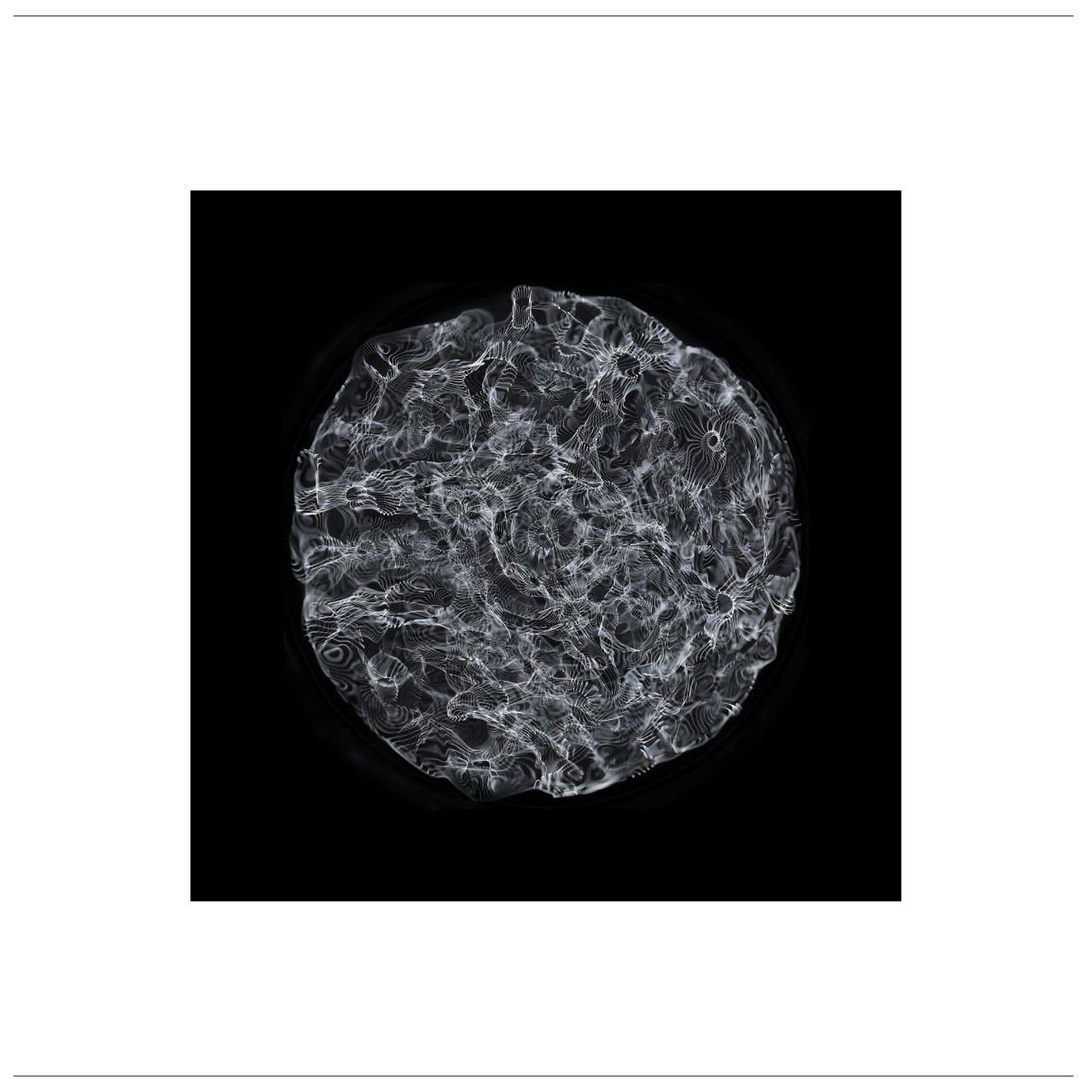 沼島の「石英の奏でる音」を琵琶湖に浮かぶ竹生島の「弁財天の霊水」にサイマティクスという器械を通して転写し映し出された紋様。何もない水面に紋様が浮かび上がってくる様は、まるで「無」から「有」が生まれ出ずる神秘に立ち会っているかのよう。